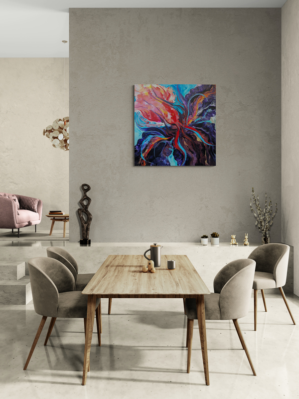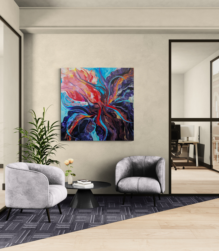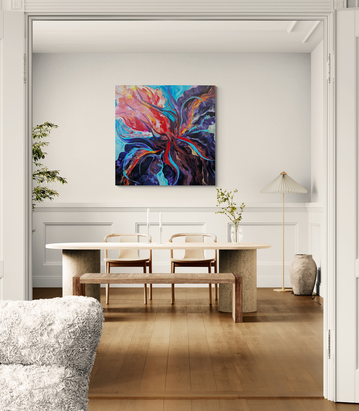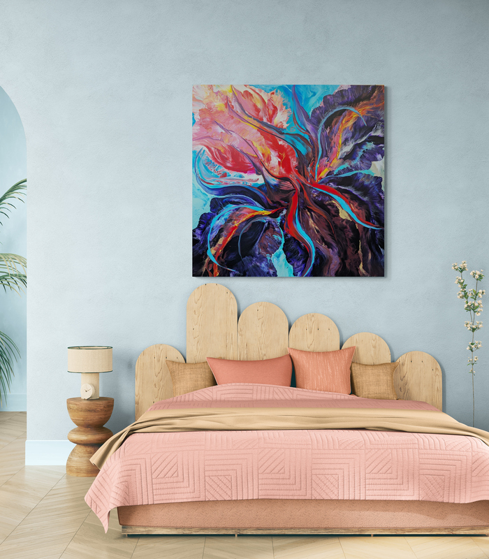 This painting celebrates one of my favorite flowers, the bearded iris, in an abstracted view, using wildly bold colors: bright magenta, pink and orange, red and blues, on a large canvas. It’s a piece meant to inspire bold, high energy, inner confidence and grounding, encouraging you to give it your all, without restraint.